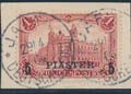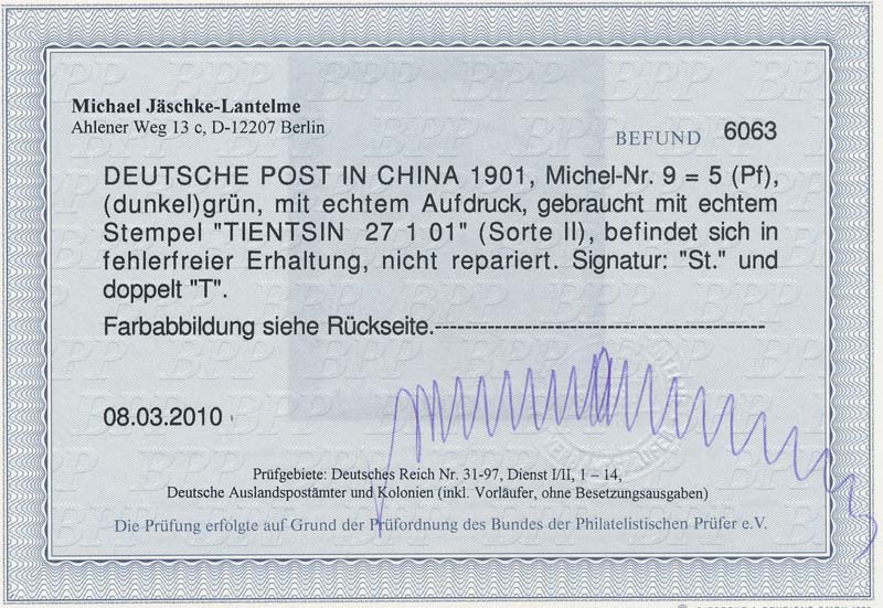 5 Pf. Handstpl.-Aufdruck zentrisch gestpl. "TIENTSIN" vom 27.1.01 (Sorte II) Pracht Befund Jäschke-L. "echt u. einwandfrei" |