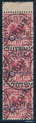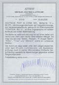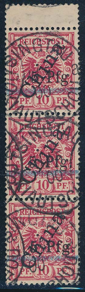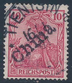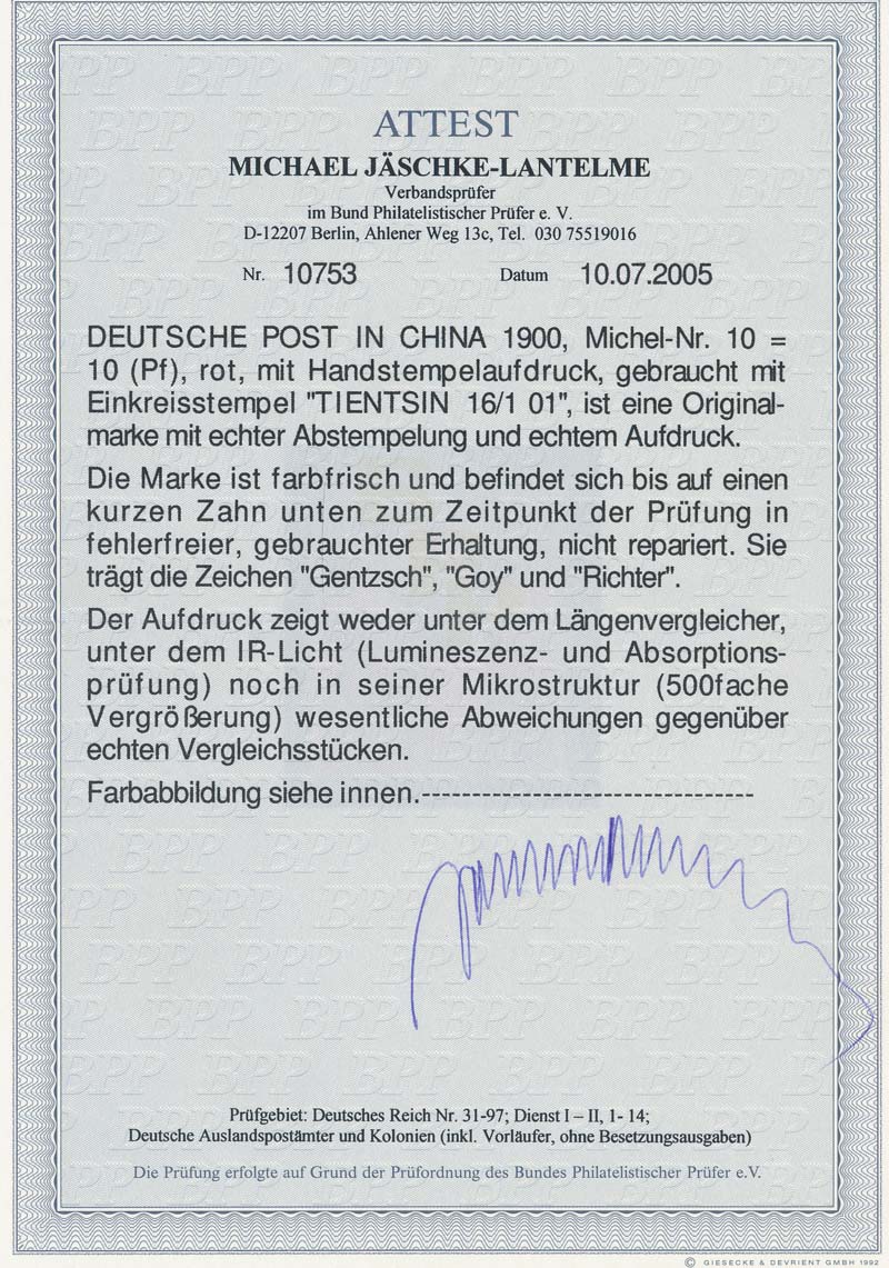 10 Pf. Handstpl.-Aufdruck zentrisch gestpl. "TIENTSIN" vom 16.1.01 unten kurzes Zähnchen sonst tadellos mehrfach sign. u. Fotoattest Jäschke-L. |
