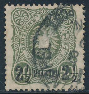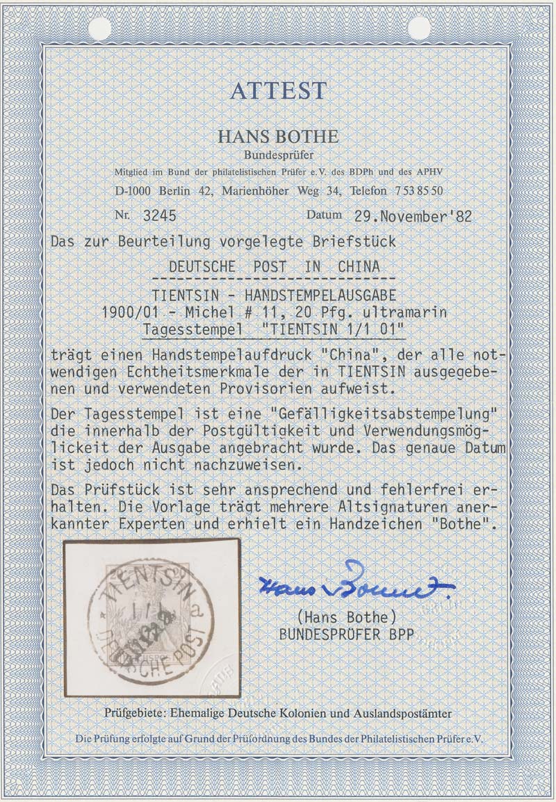 20 Pf. Handstpl.-Aufdruck ideal gestpl. "TIENTSIN" vom 1.1.01 auf Bf.-St. LUXUS! mehrfach sign. u. Fotoattest Bothe "echt, sehr ansprechend u. fehlerfrei erhalten" |