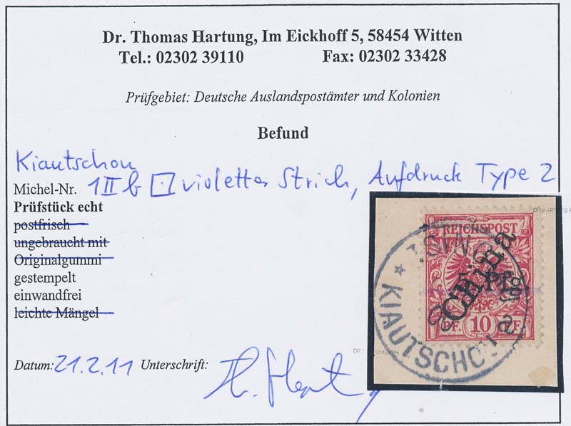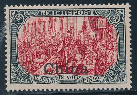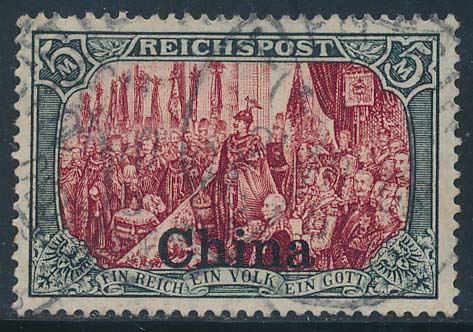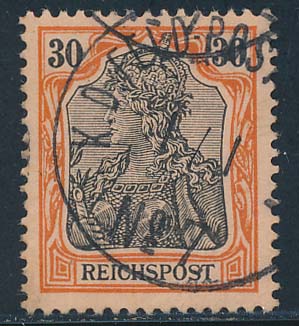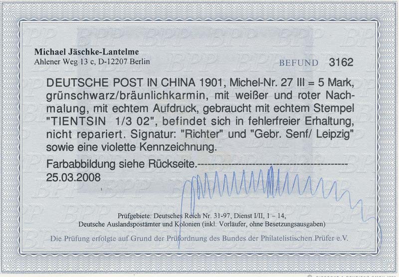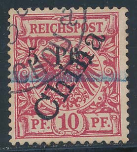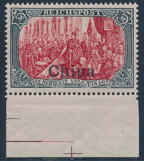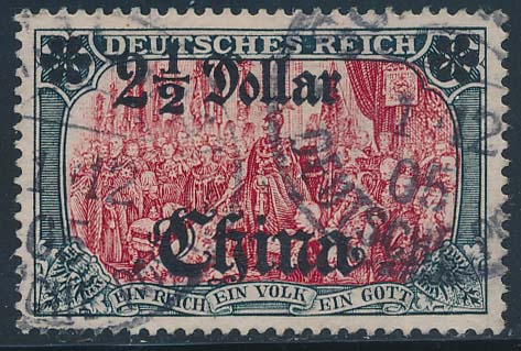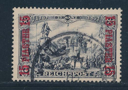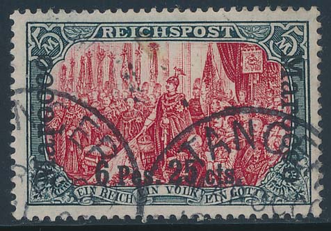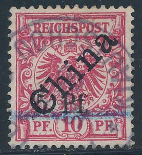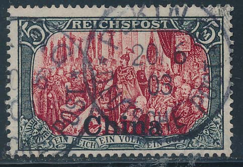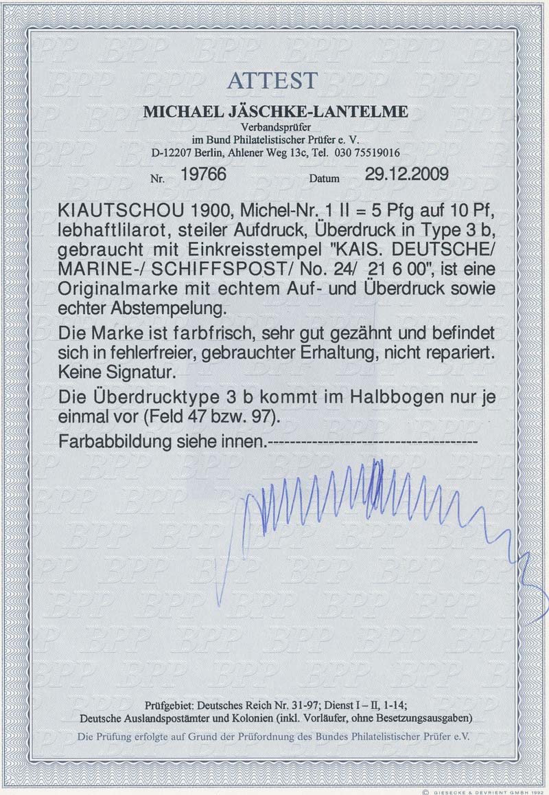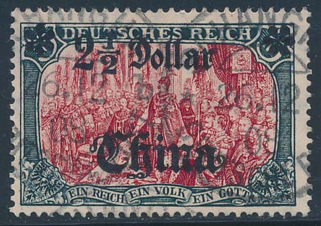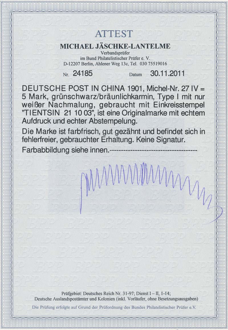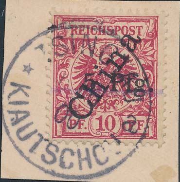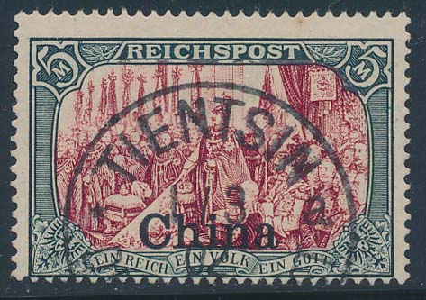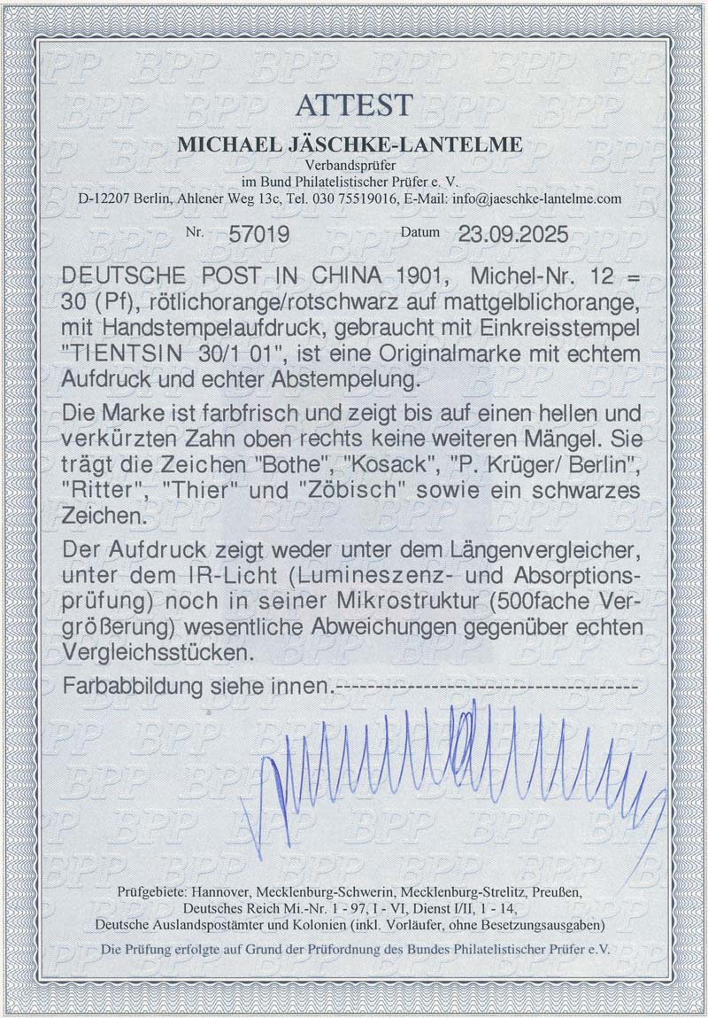 30 Pf. Handstpl.-Aufdruck mit zentrischen Stpl. "TIEN(TSIN) vom 30.1.01 mehrfach sign. u. neues Fotoattest Jäschke-L."echt, bis auf einen hellen u. verkürzten Zahn oben rechts keine weiteren Mängel" eine seltene Marke |