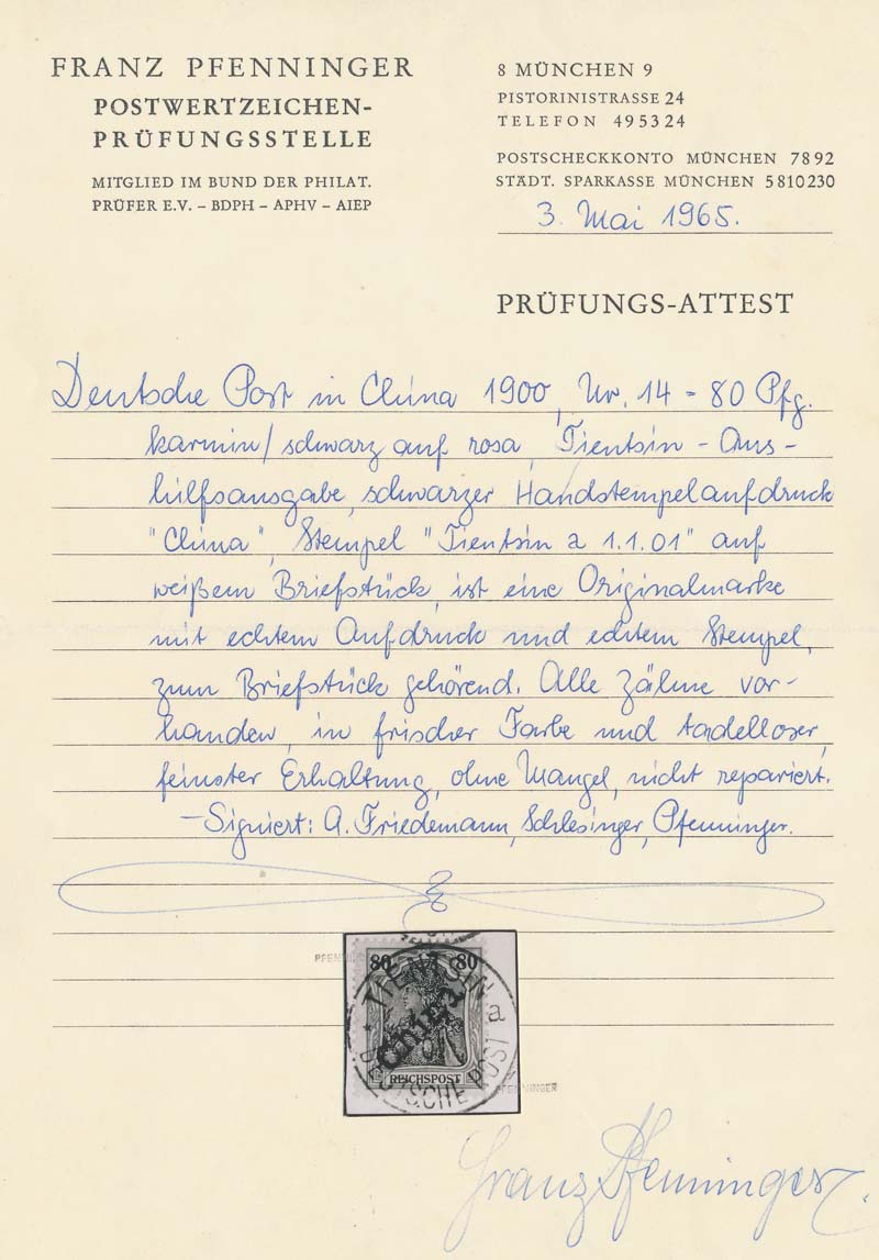 80 Pf. Handstpl.-Aufdruck auf Bf.-St. mit idealen Stpl. "TIENTSIN" vom 1.1.01 (Sorte II) LUXUS! mehrfach sign. u.a. Pfenninger mit Fotoattest "echt, in tadelloser feinster Erhaltung" |