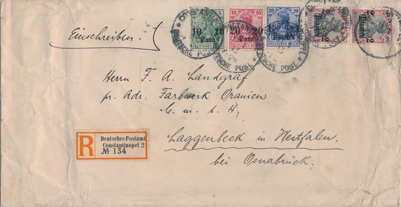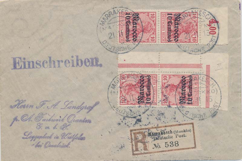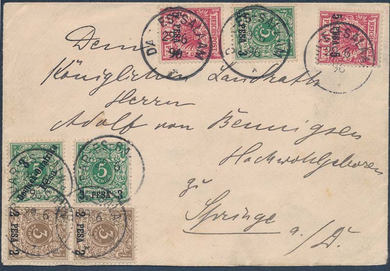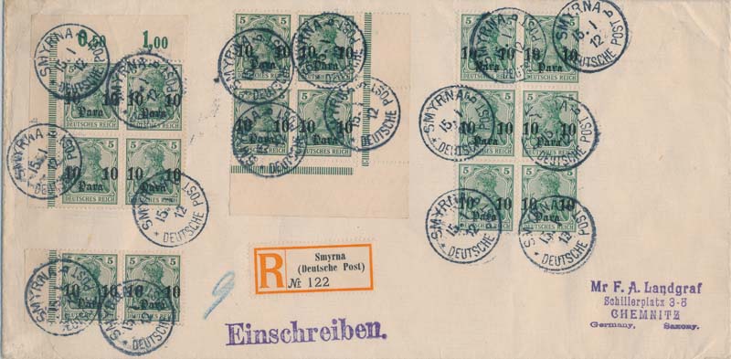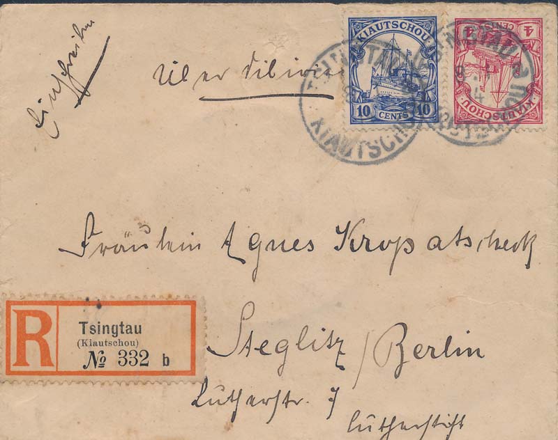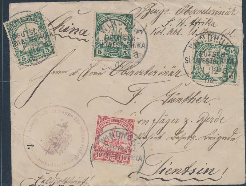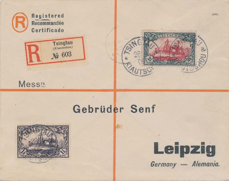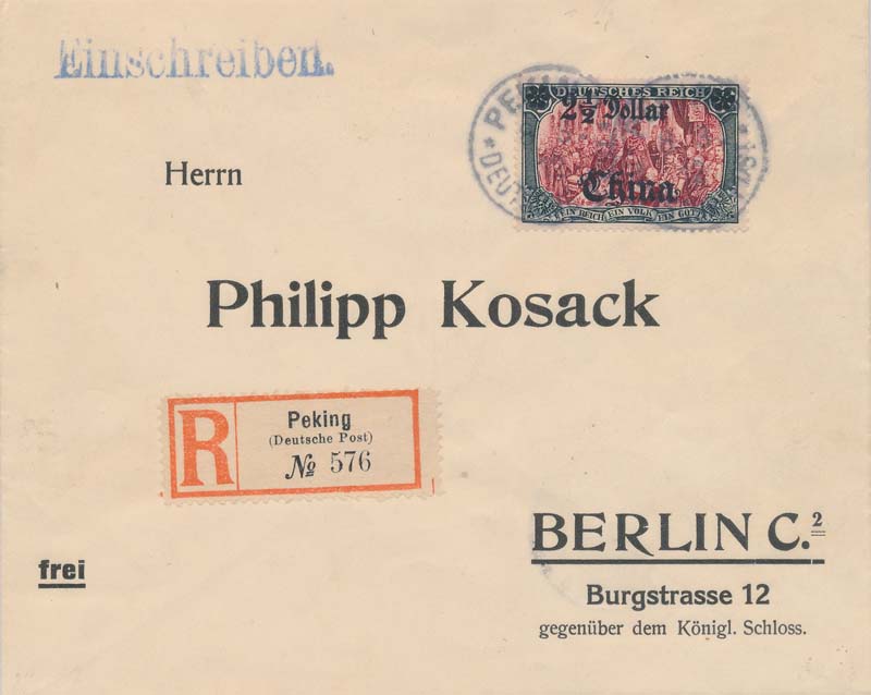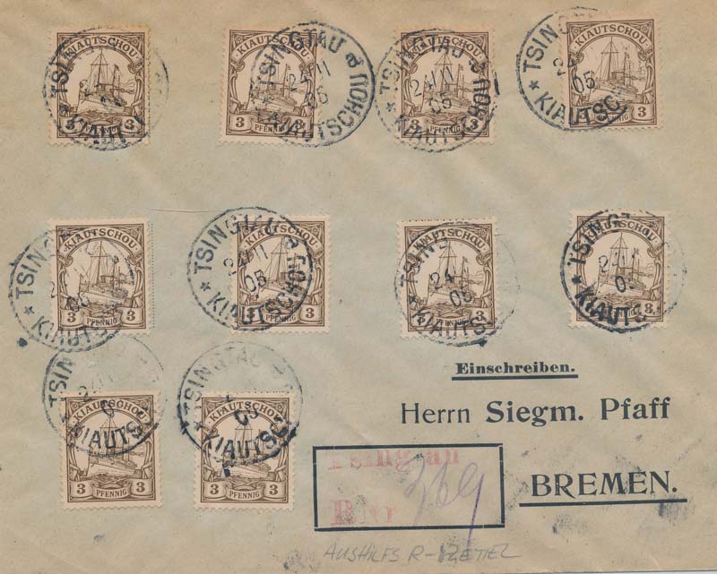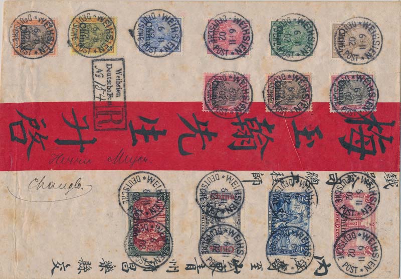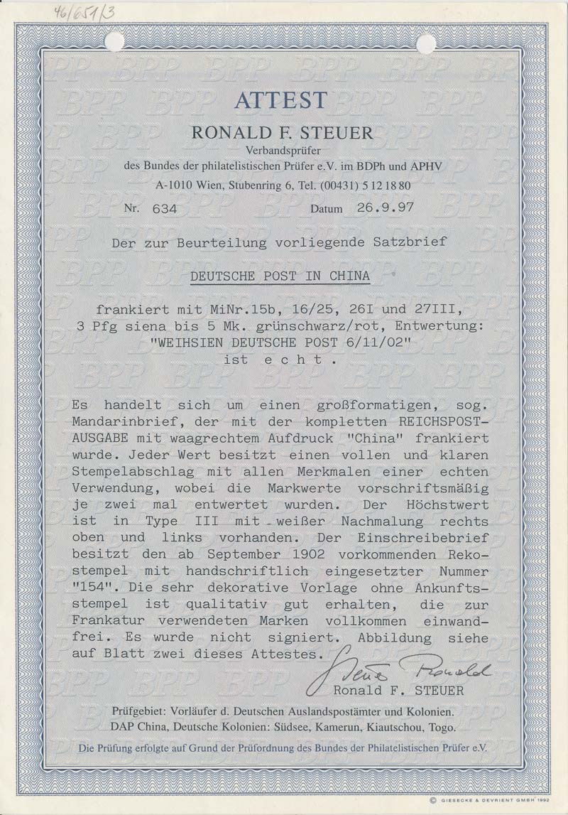 3 Pf. bis 5 Mk Reichspost kpl. auf R-Madarinbf. ab Weihsien vom 6.11.02 je ideal gestpl., toller Satzbf. Fotoattest Steuer "echt, die sehr dek. Vorlage ohne AKS ist qualitativ gut erhalten, die verwendeten Marke vollkommen einwandfrei" |