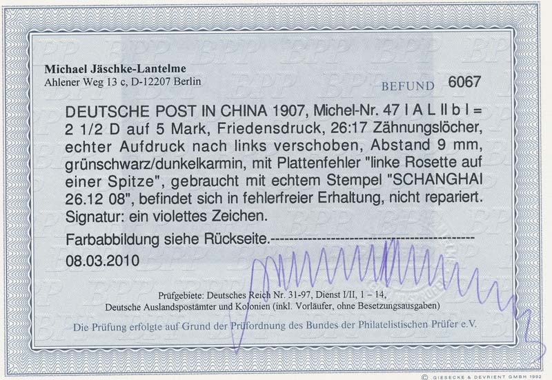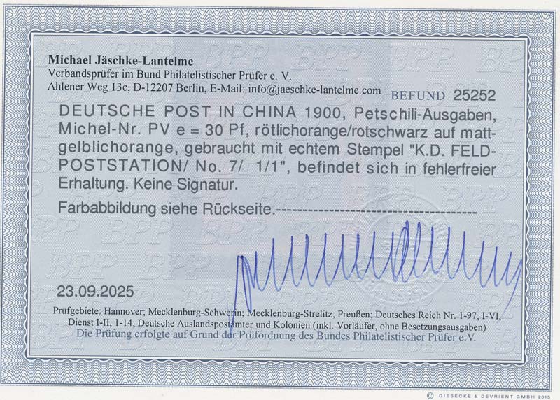 Petschili 30 Pf. Reichspost mit fast zentrischen K1 "K.D. FELDPOST(STATION) No7" Pracht neuer Befund Jäschke-L. "echt u. einwandfrei" |