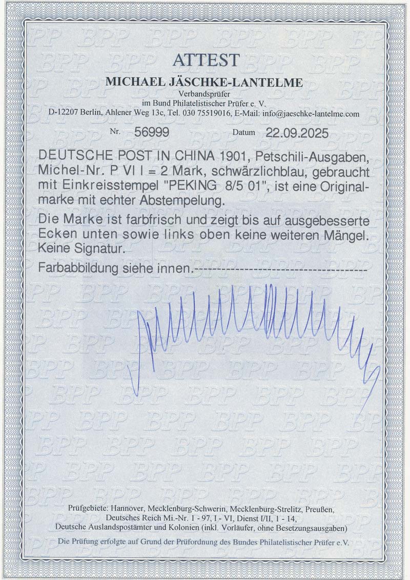 Petschili Kiautschou 2 Mk Schiffe mit 2 klaren K1 "PEKING" Eckkorrekturen seltene Marke neues Fotoattest Jäschke-L. |