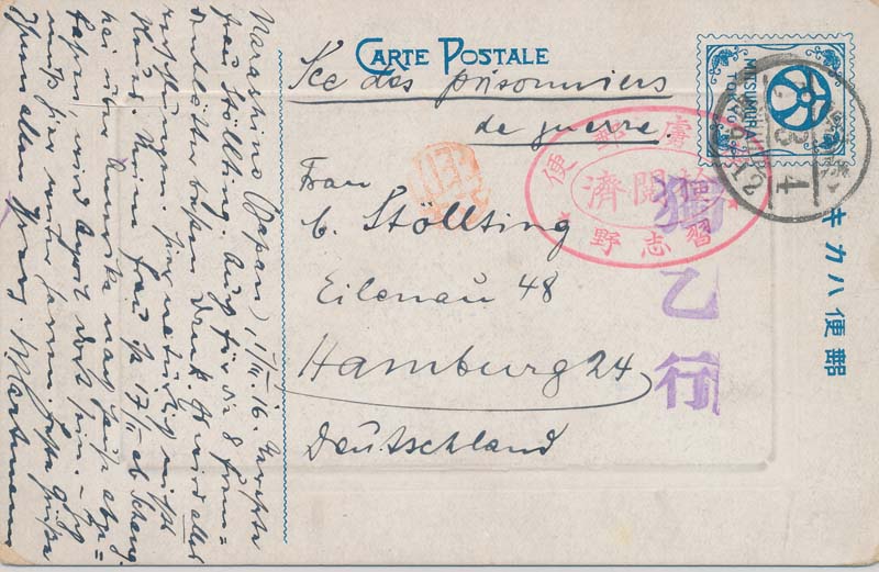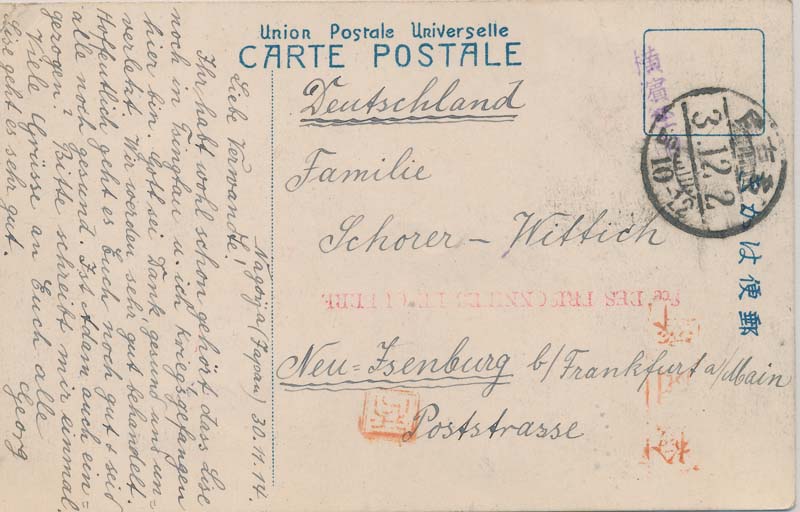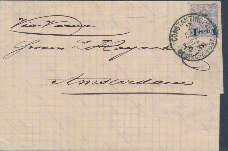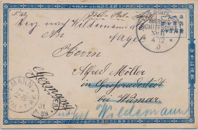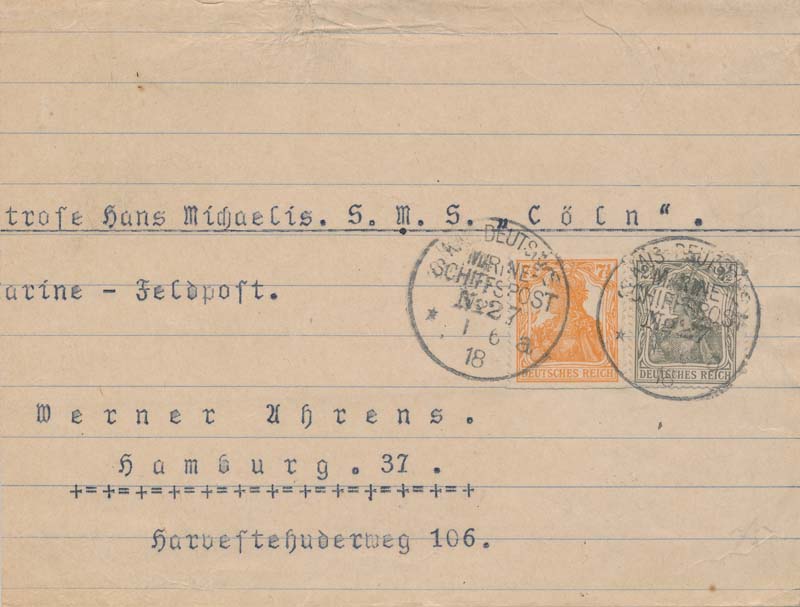 DR 2½ u. 7½ Pf. Germania zusammen auf Streifband mit 2 glasklaren Stpl. "K.D.M.S. No27" vom 1.6.18 nach Hamburg, Abs. Matrose Hans Michaelis S.M.S. "CÖLN" Marken Mängel aber seltene Verwendung! |