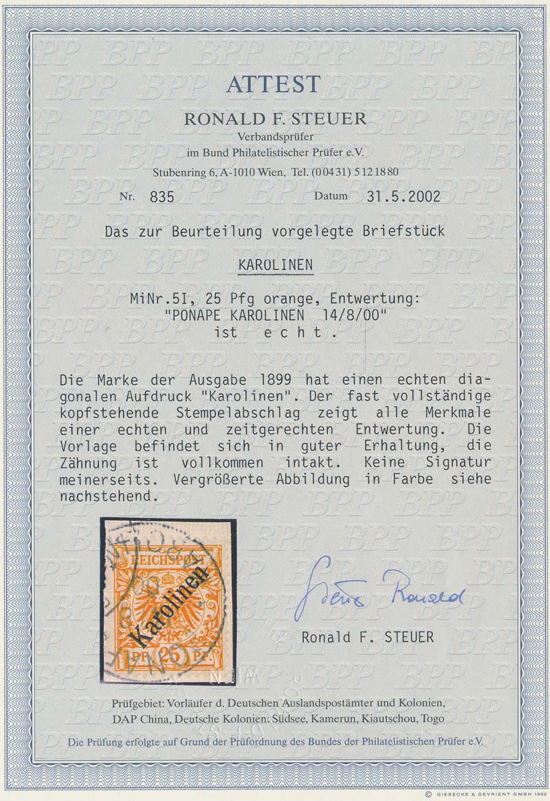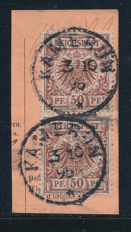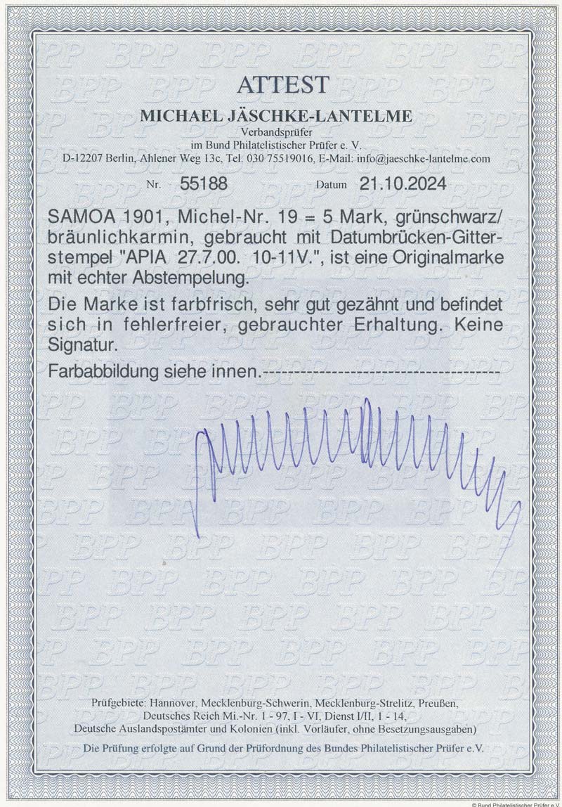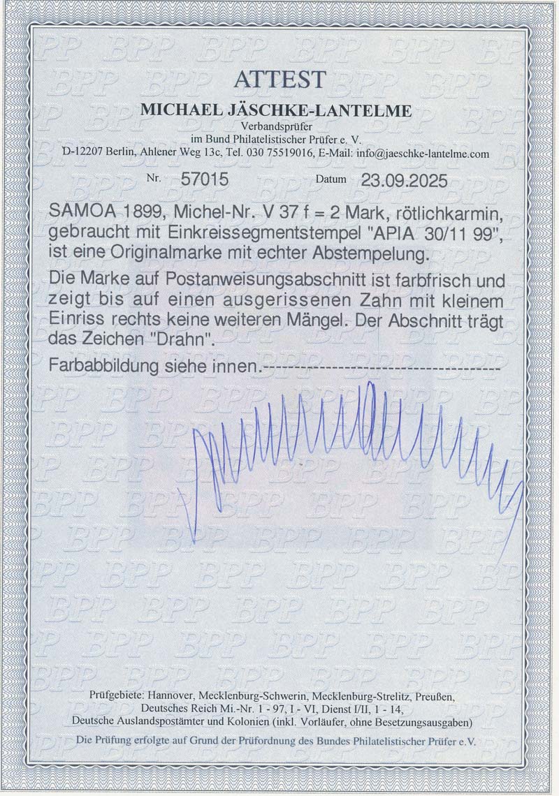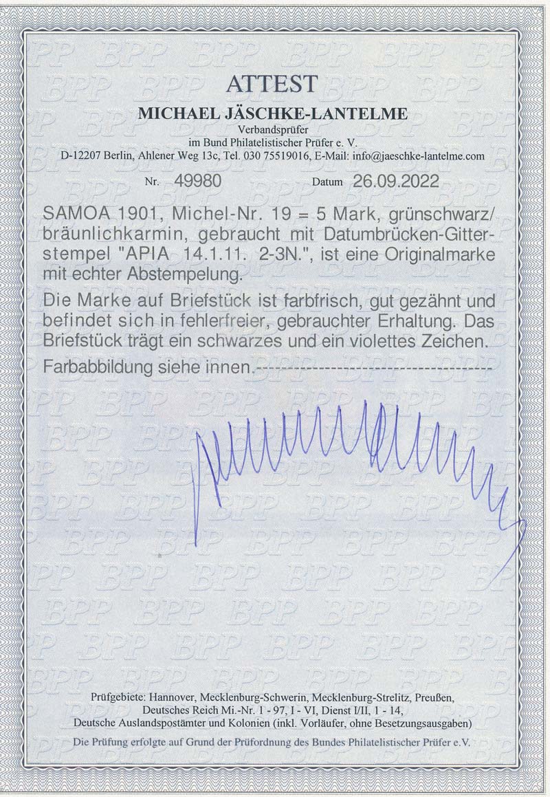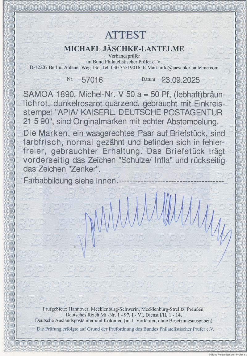Vorläufer 50 Pf. Krone-Adler "a"-Farbe im auf Bf.-St. mit glasklaren Stpl. "APIA" vom 21.5.90 tadellos! neues Fotoattest Jäschke-L. "echt u. einwandfrei" |