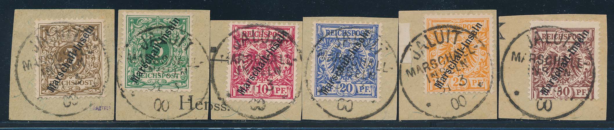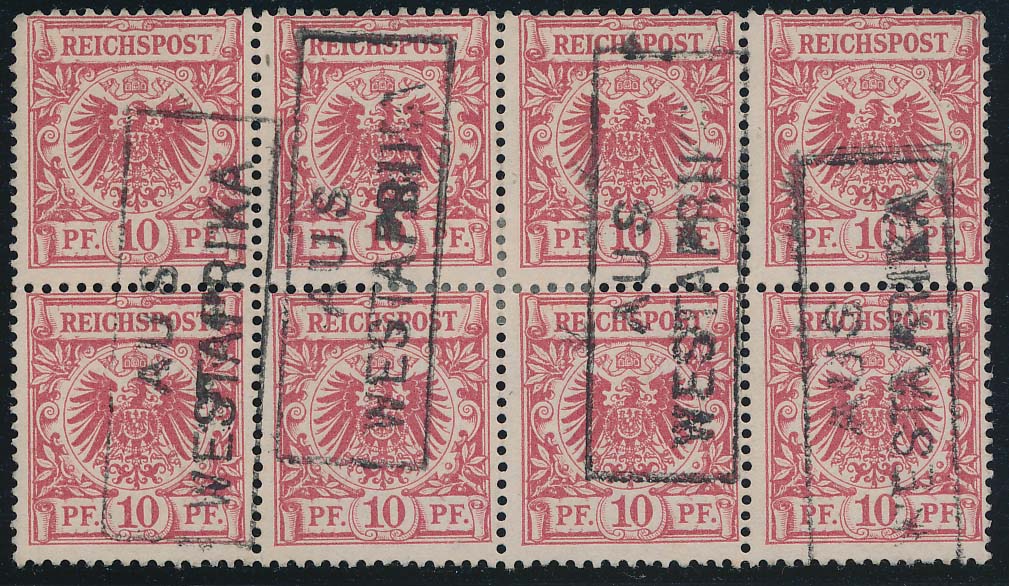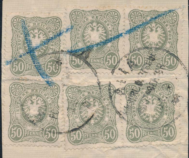 Vorläufer 50 Pf. 6 St. in 3 Paare zusammen auf etwas bügigen Bf.-St. mit Stpl. "APIA" sowie teils mit Blaustift entwertet |