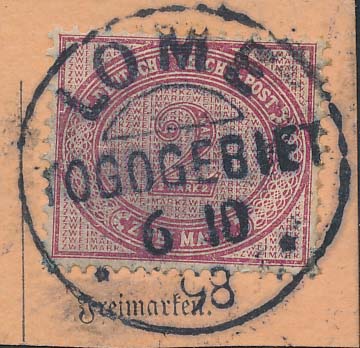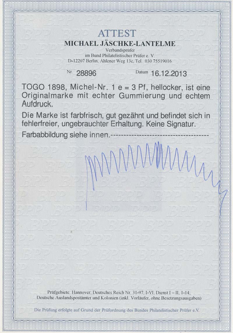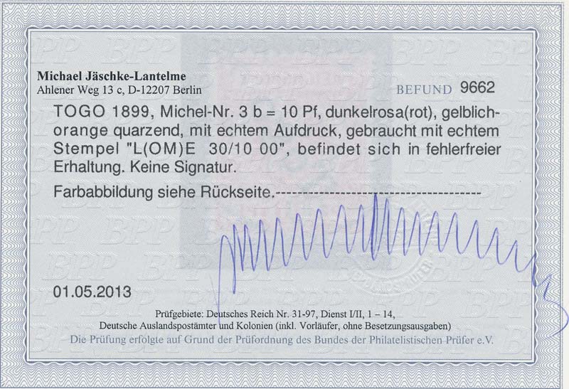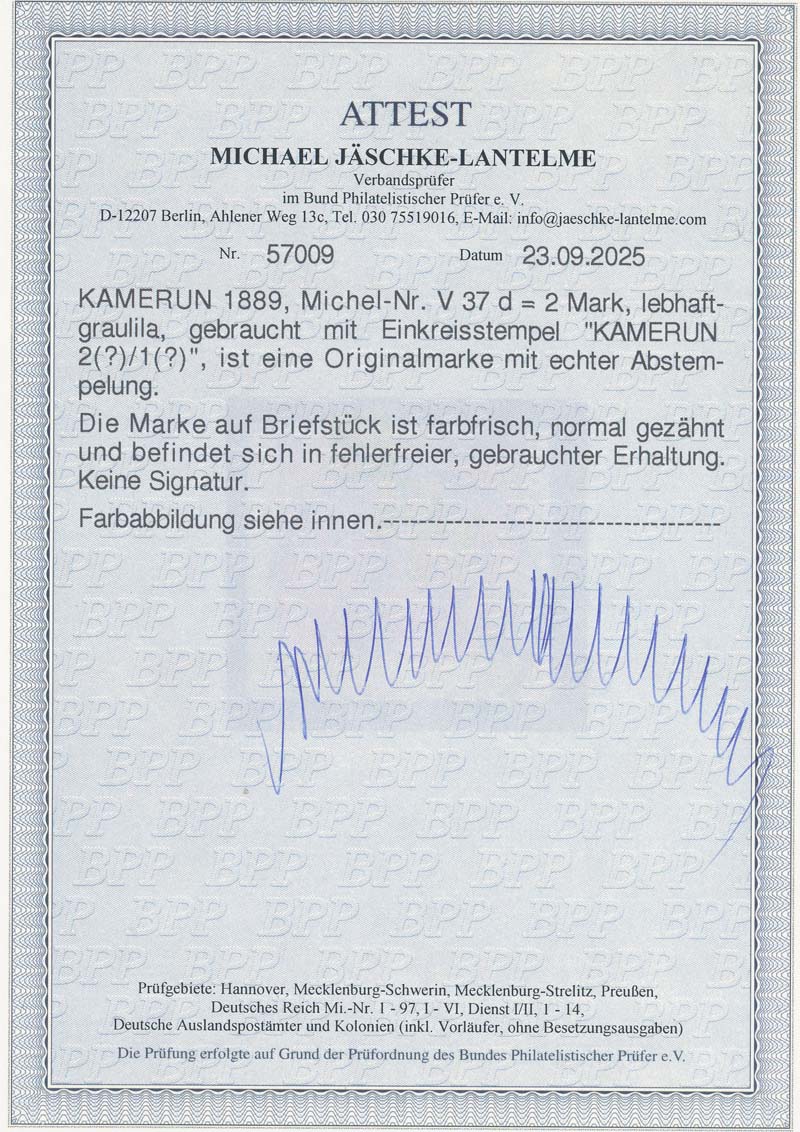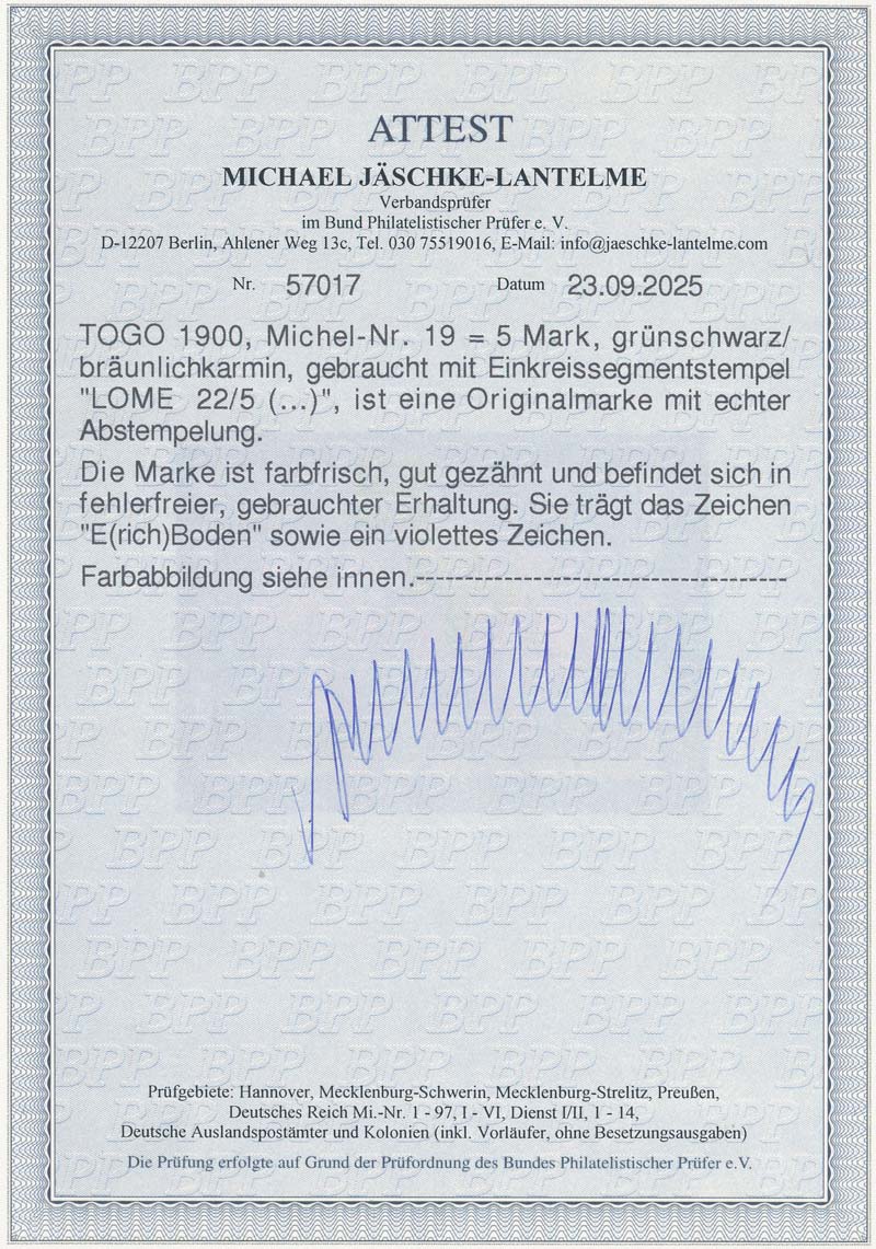 Vorläufer 2 Mk Ziffer "e"-Farbe Prachtwert auf Bf.-St. mit idealen Stpl. "LOME" gepr. Bothe |