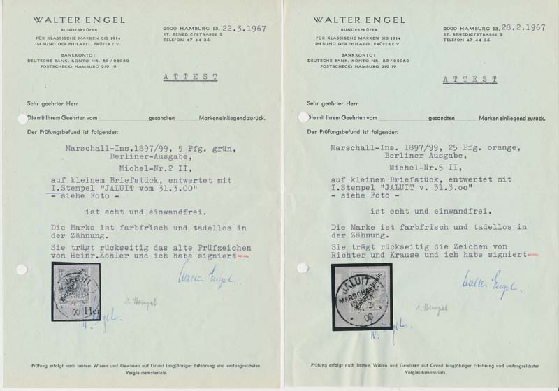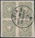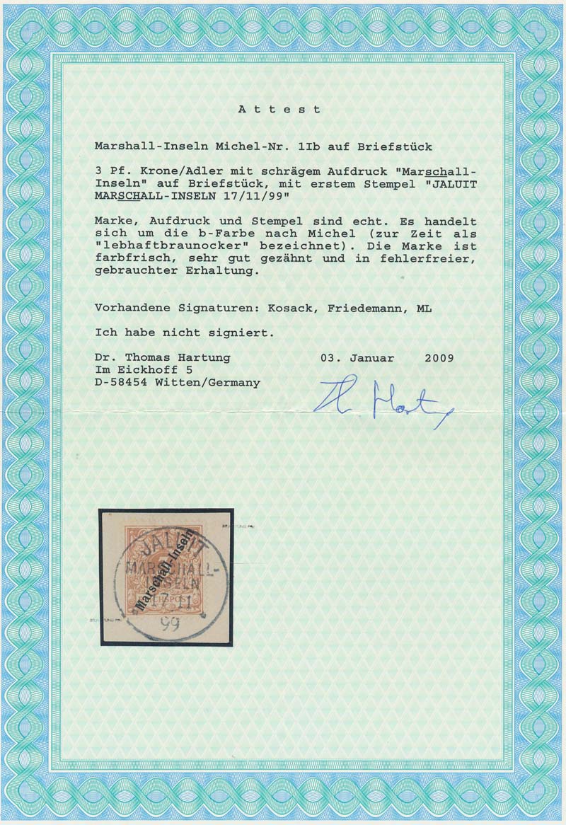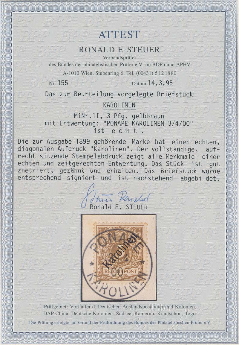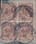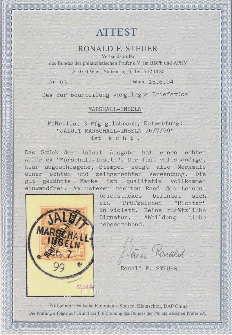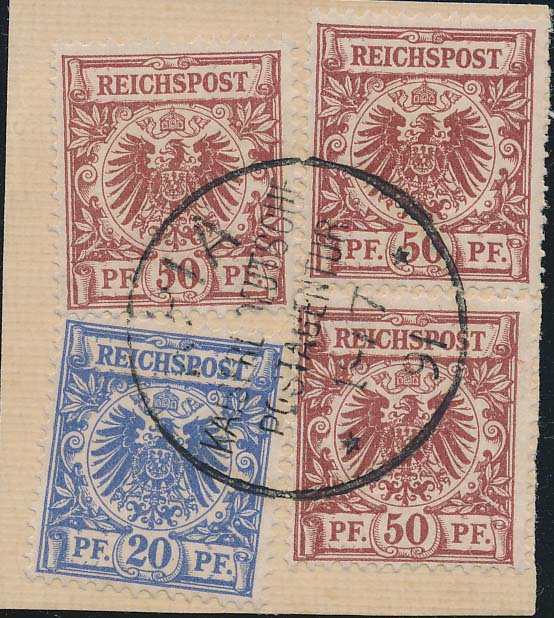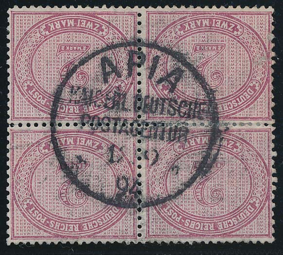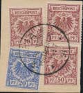 Vorläufer 50 Pf. Krone-Adler "b"-Farbe 3 St. zusammen mit 20 Pf. Krone-Adler "a"-Farbe auf Bf.-St. mit zentrischen Stpl. "APIA" vom 19.7.91 Pracht Fotoattest Jäschke-L. "echt u. einwandfrei" |