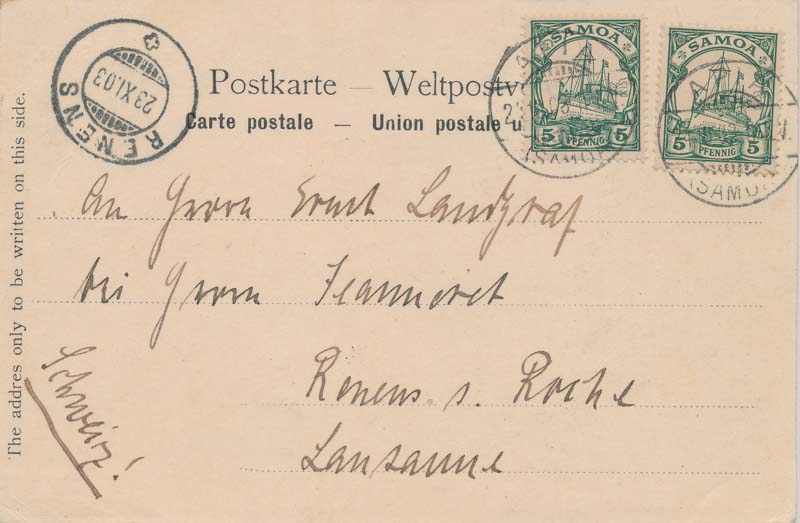 5 Pf. Schiffe ohne Wz als MeF auf AK ab Apia vom 24.10.03 in die Schweiz |
