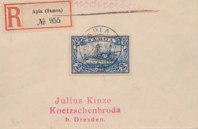 2 Mk Schiffe als EF auf R-Bf. ab Apia v. 7.7.06 nach Koetschenbroda sign. Star |