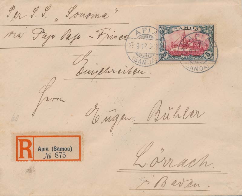 5 Mk Schiffeohne Wz als EF auf R-Bf. ab Apia vom 25.9.12 nach Lörrach |